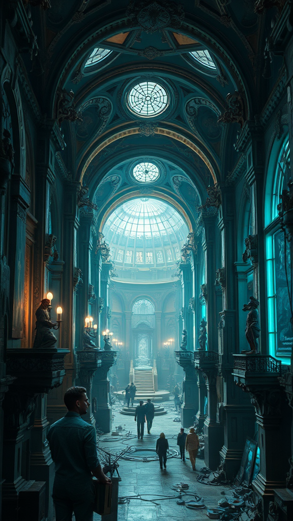 Exploration of the art gallery's finest, envisioned through the styles of Oliver Wetter and Alberto Seveso, merging into a cyberpunk dystopian tableau. Dark bronze intertwines with vivid cyan, constructing intricate architectures reminiscent of Artemisia Gentileschi's dramatic touch. The palette dances between deep gray shadows and light aquamarine highlights, harmonizing into a surreal and detailed scene with an ethereal ambiance. Set against an imaginative backdrop, this vision challenges reality and illusion.