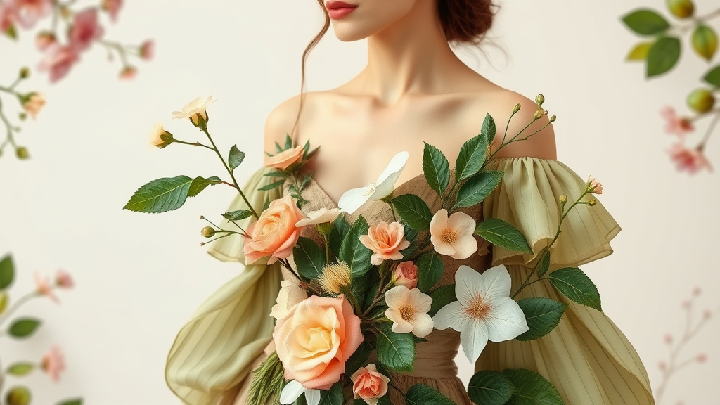 "Explore a fashion concept where elegance meets nature, drawing inspiration from the intricate beauty of botanical elements. Imagine clothing designs that seamlessly intertwine floral motifs with organic textures, creating a tapestry of natural sophistication. Envision a collection that embraces the soft hues of blooming gardens, harnessing earth tones and vibrant greens to capture the essence of nature's palette. Consider how these designs, rich in the details of petal-like layers and vine-inspired silhouettes, offer a fresh take on elegance that is both wearable and timeless."