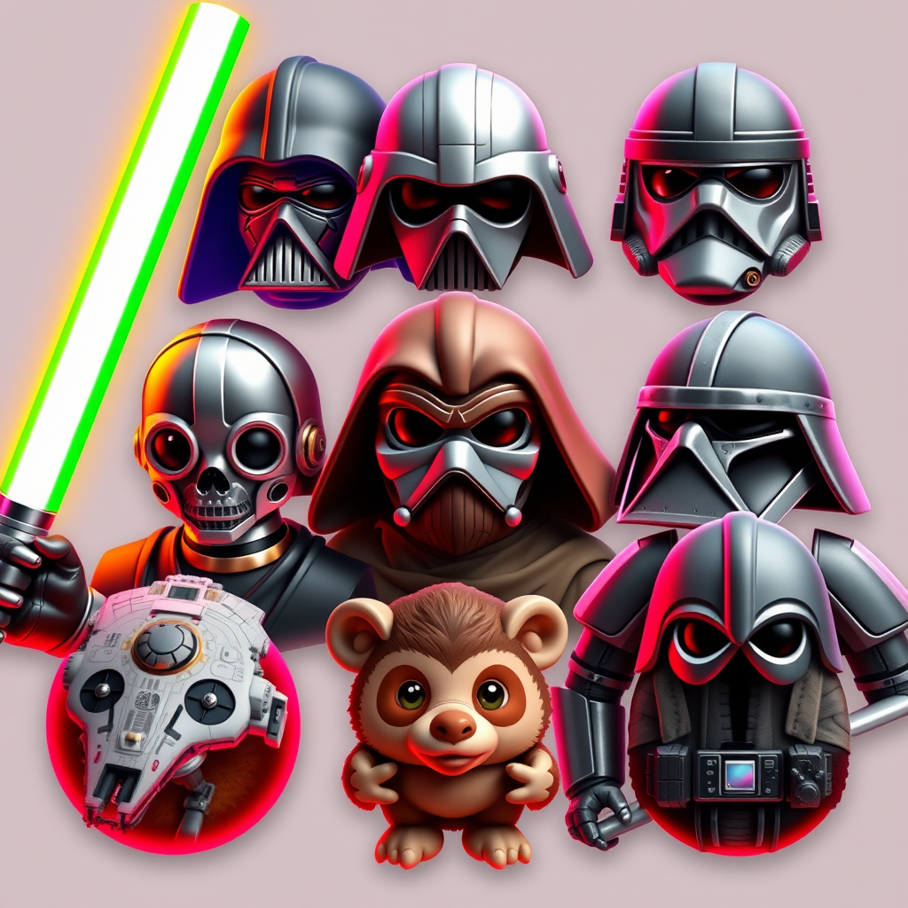 Explore an intricate and vibrant tableau of eight unique and lifelike Star Wars emojis, each meticulously detailed and rendered in stunning 8k using an octane render. Envision the iconic lightsaber glowing with a soft, ethereal luminescence, while a charming droid displays a spectrum of mechanical intricacies. Imagine a fierce Sith lord portrayed with a menacing, shadowy aura, and a wise Jedi master exuding calm and wisdom. Include the Millennium Falcon with hyper-realistic textures and a detailed cockpit, alongside the majestic Death Star, capturing its formidable presence. Picture a lovable Ewok with intricate fur details and expressive features, and an intergalactic bounty hunter, showcasing advanced armor with subtle, weathered textures. This vibrant and detailed collection captures the essence of the Star Wars universe, each emoji telling a story through its rich design and vivid colors.
