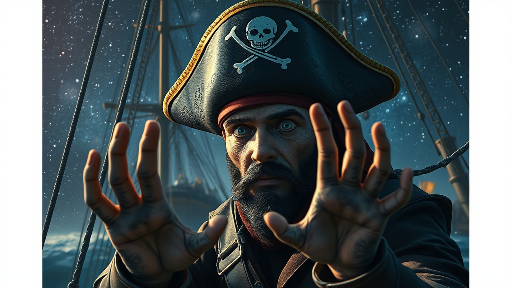Explore the imaginative universe of a space pirate inspired by the style of Sam Bosma, where a lone man dons a Jolly Roger hat aboard a steampunk ship. This scene is crafted with cinematic composition and dramatic lighting, showcasing high detail in an ultra-high-definition (16k) display with HDR quality. The character's eyes have a unique appearance with slightly deformed irises and pupils, adding a mysterious allure. The setting conveys an otherworldly feel, with his hands displaying subtle mutations that suggest a life filled with cosmic adventure and transformation. Set against the backdrop of an expansive starry sky, the overall image retains a sense of the unexpected and fantastical, without any distracting elements like text or watermarks, ensuring a clean, immersive visual experience.