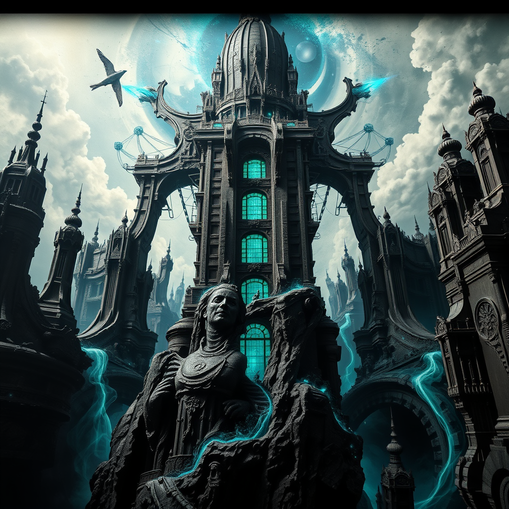 Explore the pinnacle of artistic expression within a gallery that marries the surreal dreamscapes of Oliver Wetter with the dynamic fluidity of Alberto Seveso, set against a cyberpunk dystopia. Here, intricate architectures rise like dark bronze monoliths brushed with vibrant cyan highlights. The ambiance resonates with the drama and intensity of Artemisia Gentileschi's work, enveloped in a palette of deep gray shadows intermixed with light aquamarine accents, creating an atmosphere of haunting beauty.