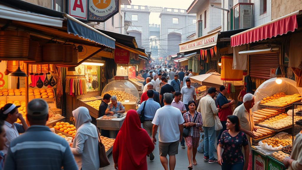 Explore the vibrant marketplace at dawn, where vendors eagerly set up colorful stalls, the air infused with the aroma of freshly baked bread and exotic spices, while shoppers weave through the lively crowd, searching for hidden treasures and new experiences.