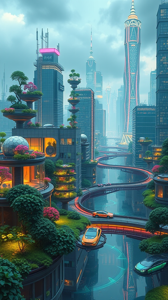 Explore the vibrant world of a futuristic city where technology and nature coexist in harmony, featuring floating gardens, bioluminescent skyscrapers, and autonomous transportation weaving seamlessly through the lush urban landscape.