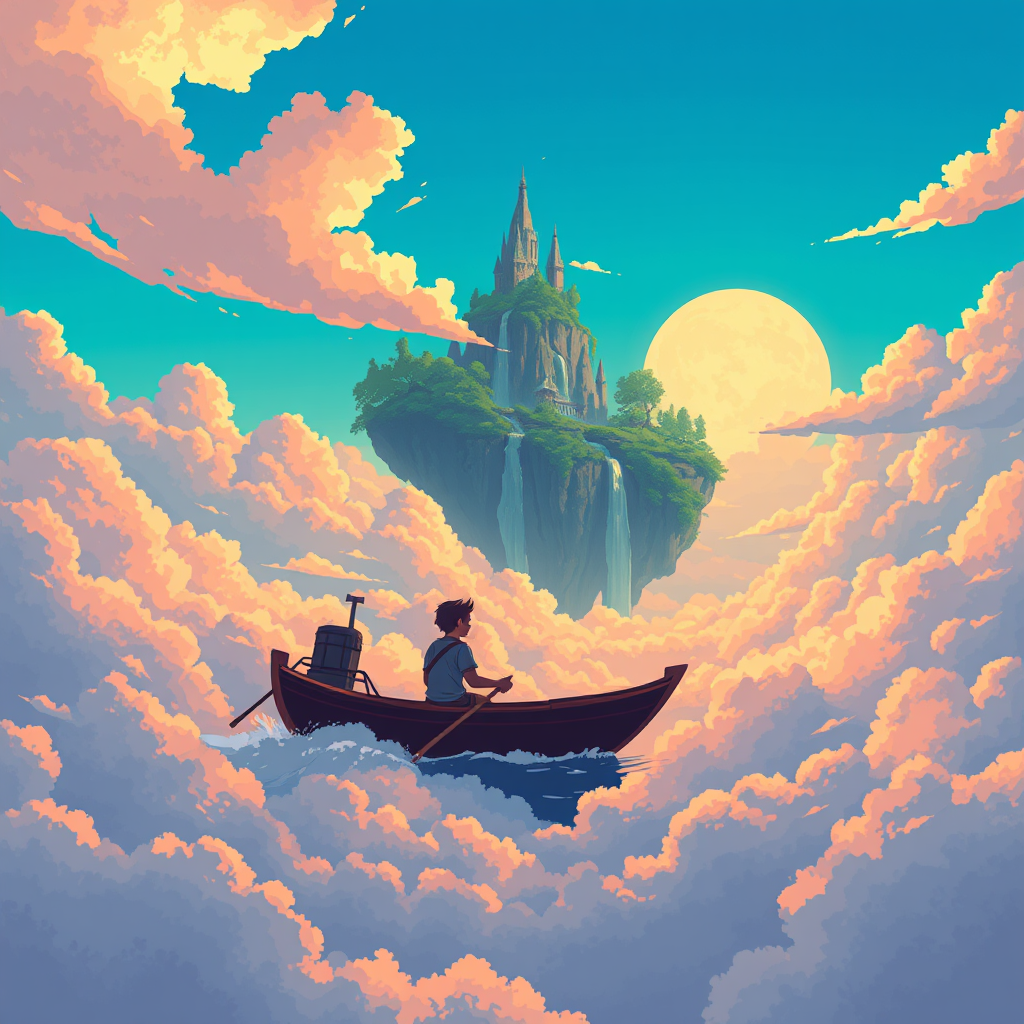 Explorer in a small boat sailing through a sea of fluffy clouds towards a mystical floating island, vibrant 16-bit pixel art style, inspired by Studio Ghibli's dreamlike worlds, cinematic scene with rich detail and color depth, high dynamic range capturing the magical glow of sunset skies, island adorned with cascading waterfalls and lush greenery, the explorer silhouetted against the serene expanse, artwork in a 2:3 aspect ratio.
