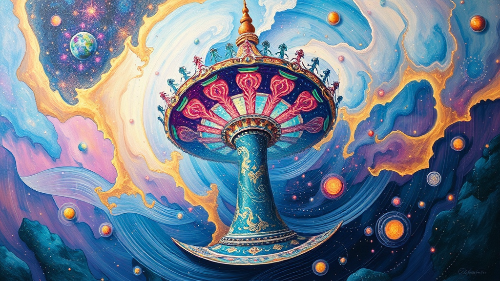 Exploring a kaleidoscope of spinning realities, the act of painting a cosmic carousel where dimensions merge and overlap, each universe a vibrant hue that dances in harmony, spinning melodies of eternal wonder.