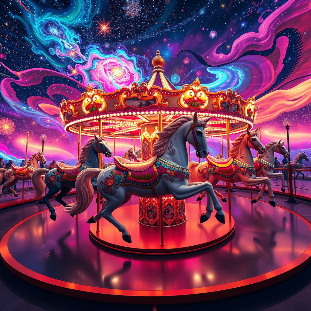 Exploring a kaleidoscope of universes, each carousel horse gallops through vibrant worlds, spinning through realms of swirling galaxies and cascading colors, with every revolution uncovering a new, fantastical landscape, where stars twinkle like carousel lights in an endless cosmic fairground.