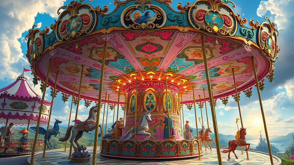 Exploring a kaleidoscopic multiverse of carousels, where each spin reveals fantastical worlds teeming with vibrant creatures and whimsical landscapes, each more enchanting than the last.
