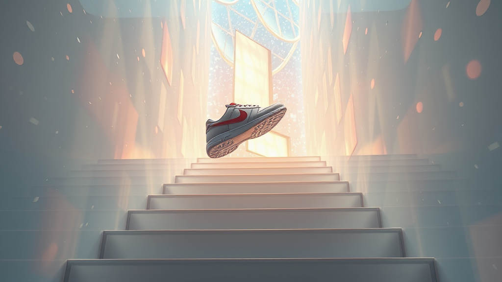 Exploring a surreal concept of stairs leading to a translucent space filled with ethereal elements, inspired by sleek modernity. Envision an experimental product design with a focus on 3D rendering using Octane, capturing the essence of tranquility with vibrant contrasts. Imagine a pair of Nike sneakers subtly floating in mid-air, embodying brightness and innovation. The visual should have a dreamlike quality, with elements of chaos and stillness blending together seamlessly, creating a striking and imaginative narrative.