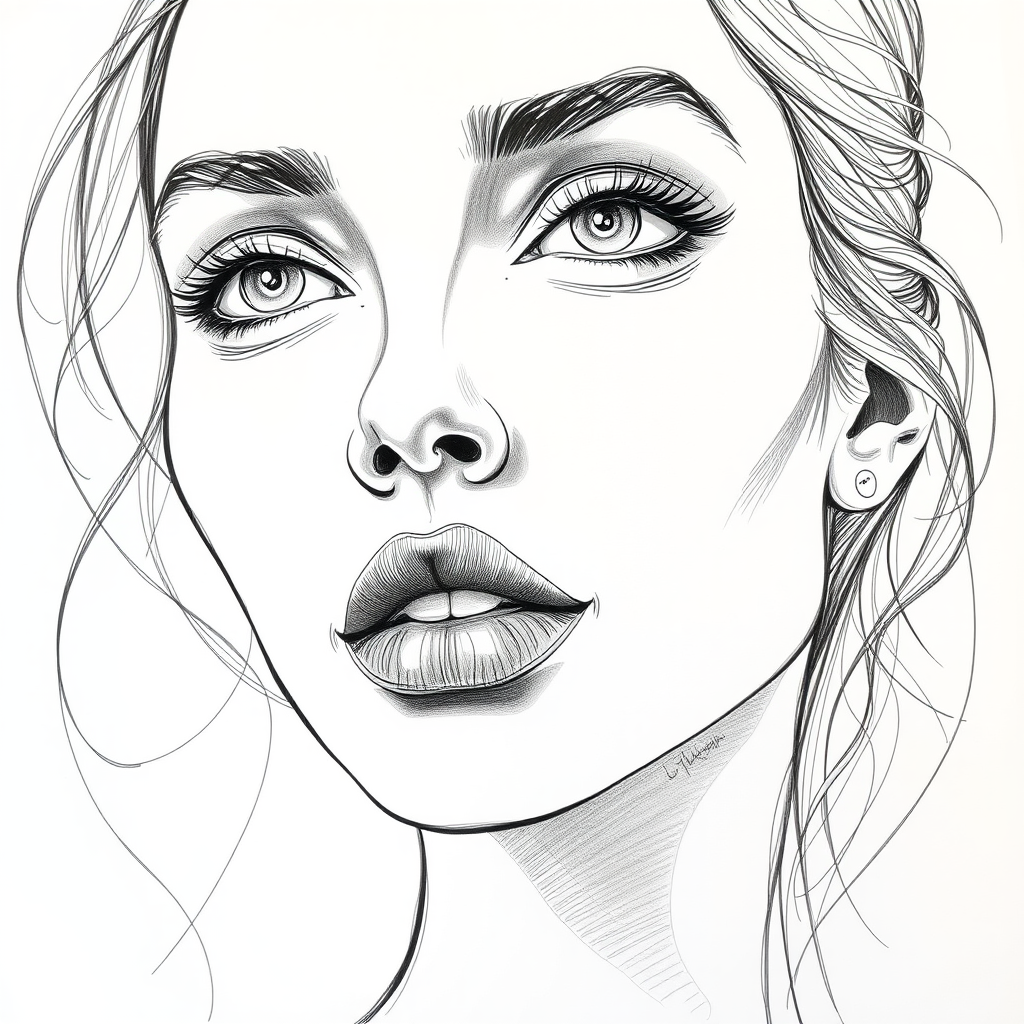 Expressive line drawing of a woman's face, capturing elegance and emotion, in the style of captivating portraiture with elongated proportions, intricate details, fluid lines, subtle play of light and shadow, accentuating the natural beauty and character.
