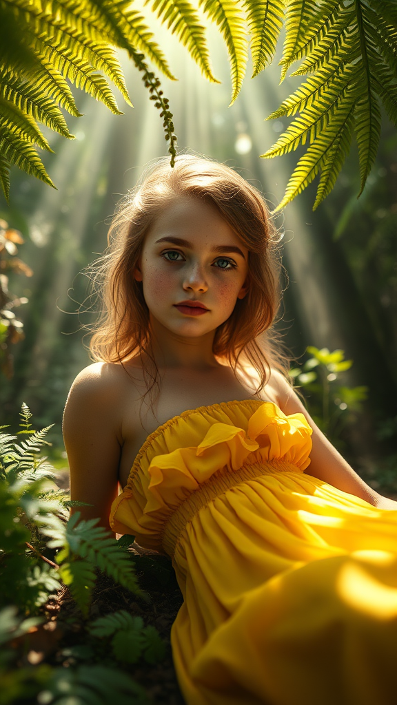 Exquisite 4k ultra-detailed masterpiece, realistic portrait of a freckled girl in a sunflower yellow dress, reclining gracefully beneath a lush fern canopy in the heart of a serene forest. Sunlight cascades above, casting warm golden hues across her elegant form. The scene captures her delicate beauty with vibrant sunlit colors, using a shallow depth of field to highlight her perfect anatomy. A soft atmospheric aura envelops this powerful portrait, achieved through professional photography techniques. The cinematic angle reveals dynamic elements with light streaming through foliage and a gentle mist weaving softly around, creating an immersive and enchanting visual narrative.