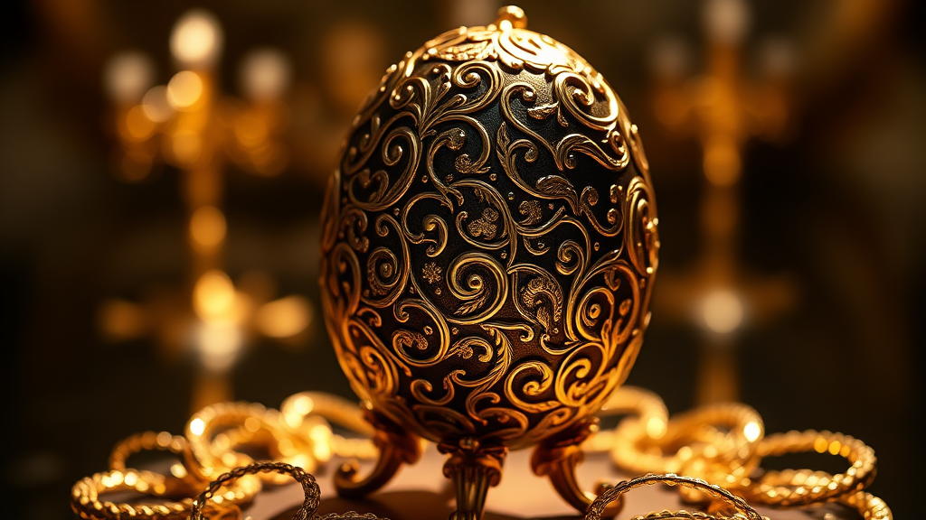 Exquisite and luxurious 4k wallpaper featuring an award-winning photograph of a Fabergé egg, showcasing intricate and mesmerizing details under cinematic lighting. The composition follows the golden ratio, capturing the elegance and sophistication of the masterpiece. The image is in pristine sharp focus, with a harmonious balance that accentuates its stunning craftsmanship. Presented in ultra high resolution with HDR quality, this official wallpaper is a testament to artistic excellence, embodying the essence of a true masterpiece with a captivating, elegant design.