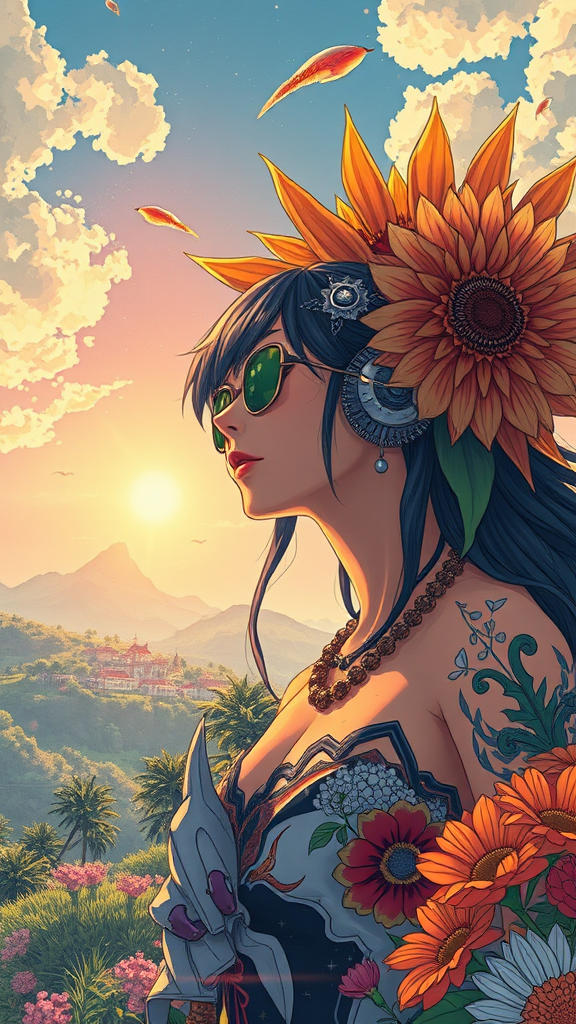 Exquisite anime artwork of a solarpunk summer day, inspired by Tim Okamura, Victor Nizovtsev, Greg Rutkowski, and Noah Bradley. Captivating on art platforms, 8k resolution, a true masterpiece with graffiti elements, incredible detail, and vibrant colors. Features an intricate, harmonious illustration using the golden ratio, celebrating the essence of nature and futurism.