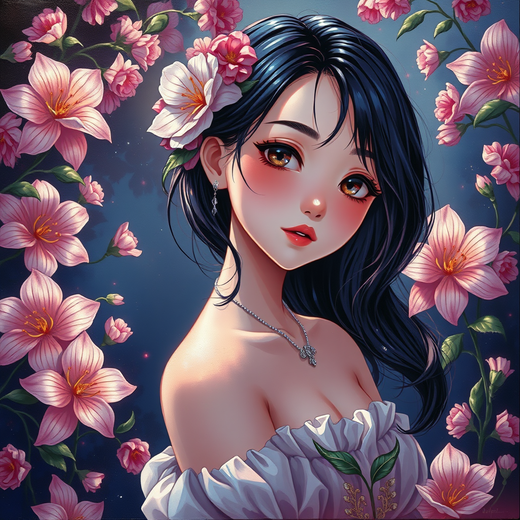 Exquisite anime-inspired artwork featuring a beautifully illustrated girl in thick acrylic style, embellished with vibrant floral decorations. The scene captures the allure of an oil painting, enhanced by striking iridescent reflections that dance across her figure. Employing chiaroscuro for dramatic contrast, the piece is enriched with holy cinematic rim lighting that exudes a sense of divine elegance, reminiscent of rococo art. This visual masterpiece brings together traditional techniques and modern flair in a captivating 2:3 aspect ratio.