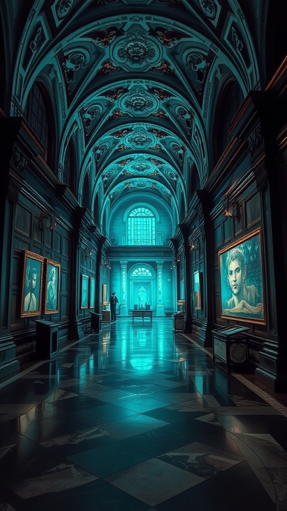 Exquisite art gallery showcase, inspired by Oliver Wetter and Alberto Seveso, featuring a cyberpunk dystopian ambiance with dark bronze and cyan hues. The scene unveils intricate architectural designs reminiscent of Artemisia Gentileschi's dramatic lighting, enhanced with a palette of dark gray and light aquamarine, invoking a sense of ethereal wonder. This vision captures an immersive blend of art and futurism, reflecting the haunting allure of a world both familiar and fantastical.