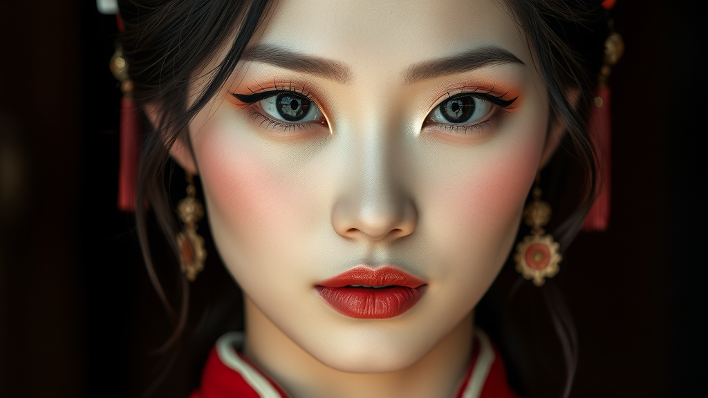 Exquisite Asian woman, porcelain-like skin, flawless and luminous, ethereal charm, monolid eyes deep and mysterious, captivating stare, eyeliner enhancing their fascination, gracefully arched eyebrows soften expressions, lips like ripe cherries subtly tinted, Embellishments of silk kimonos and intricate hair ornaments enrich her enchanting face, RAW portrait, professional photography, high resolution, 4k, enhance_negative_details_v1, refined_negative, quick_negative_effect_v2, art_deepnegative_v1_75t, rmadanegative402_sd15-enhance, pristine_image_negative_v1.3, inexperienced_artist-neg.