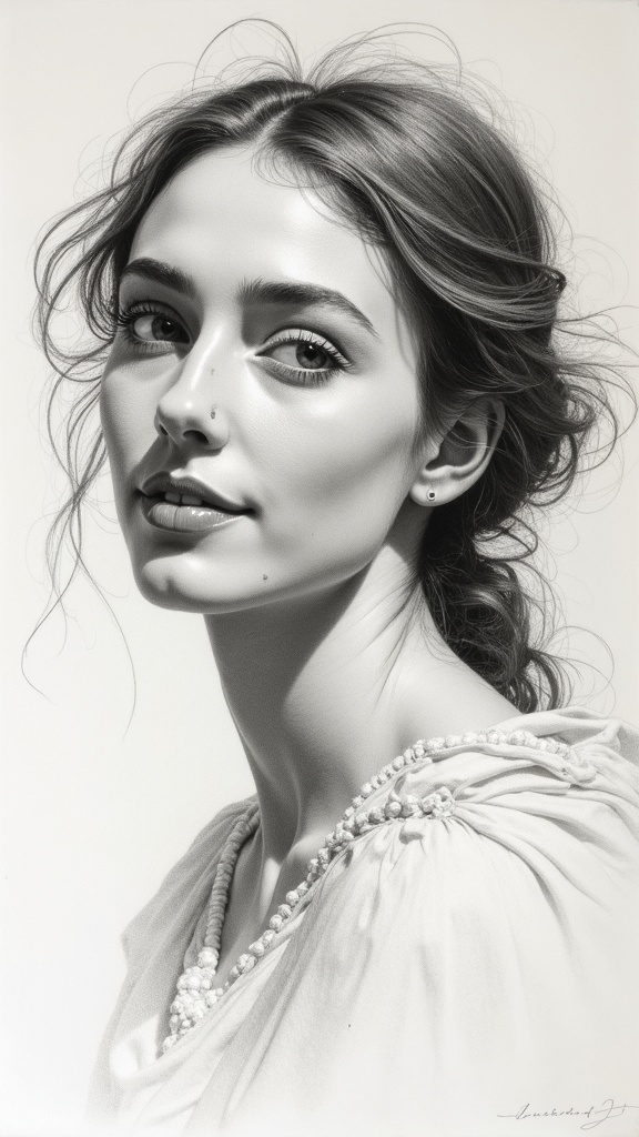 View this AI-generated image featuring exquisite charcoal sketch by leonardo da vinci capturing the serene side view of an exceptionally beautiful woman intricate details emphasize her gentle smile monochrome illustration emphasizing texture and depth face focused portrait showcasing classical elega