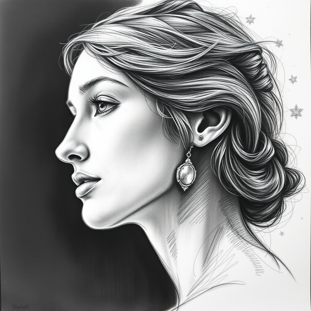 Exquisite charcoal sketch portrait reminiscent of Michelangelo, featuring a breathtakingly beautiful woman in profile. This ultra-detailed drawing captures the serene elegance of her face, with a subtle, enigmatic smile. Rendered entirely in monochrome without any color, the piece emphasizes intricate textures and contours, evoking a sense of timeless grace.