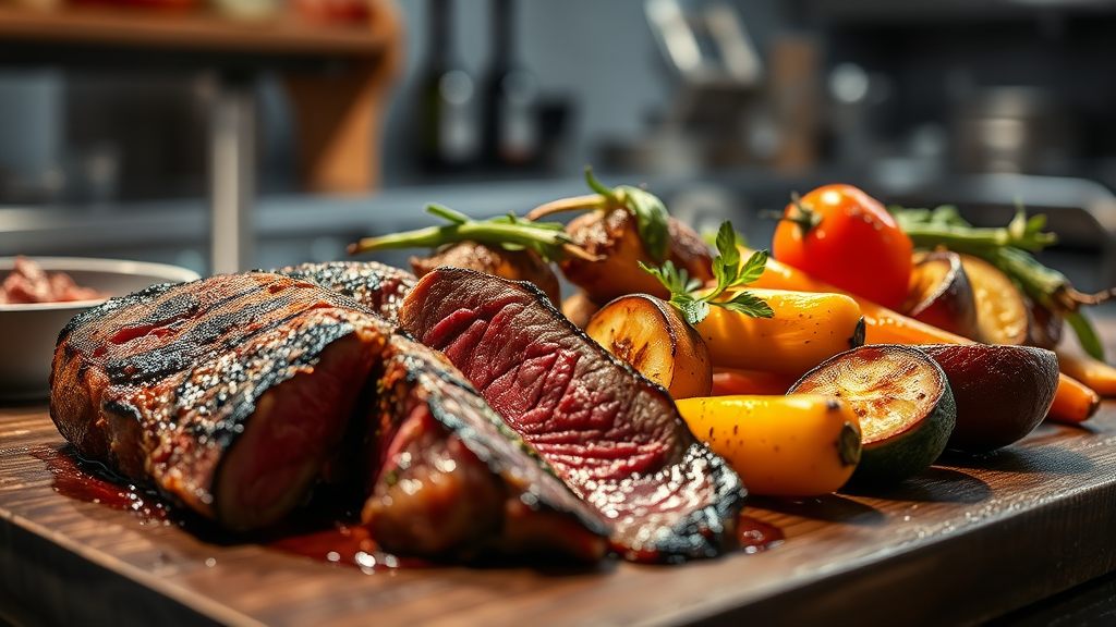 Exquisite cuisine photography capturing succulent grilled beef and vibrant grilled vegetables arranged artfully in a high-end Michelin-star kitchen atmosphere; enhanced by refined studio lighting and sharp depth of field, highlighting the ultra-detailed textures and rich colors.