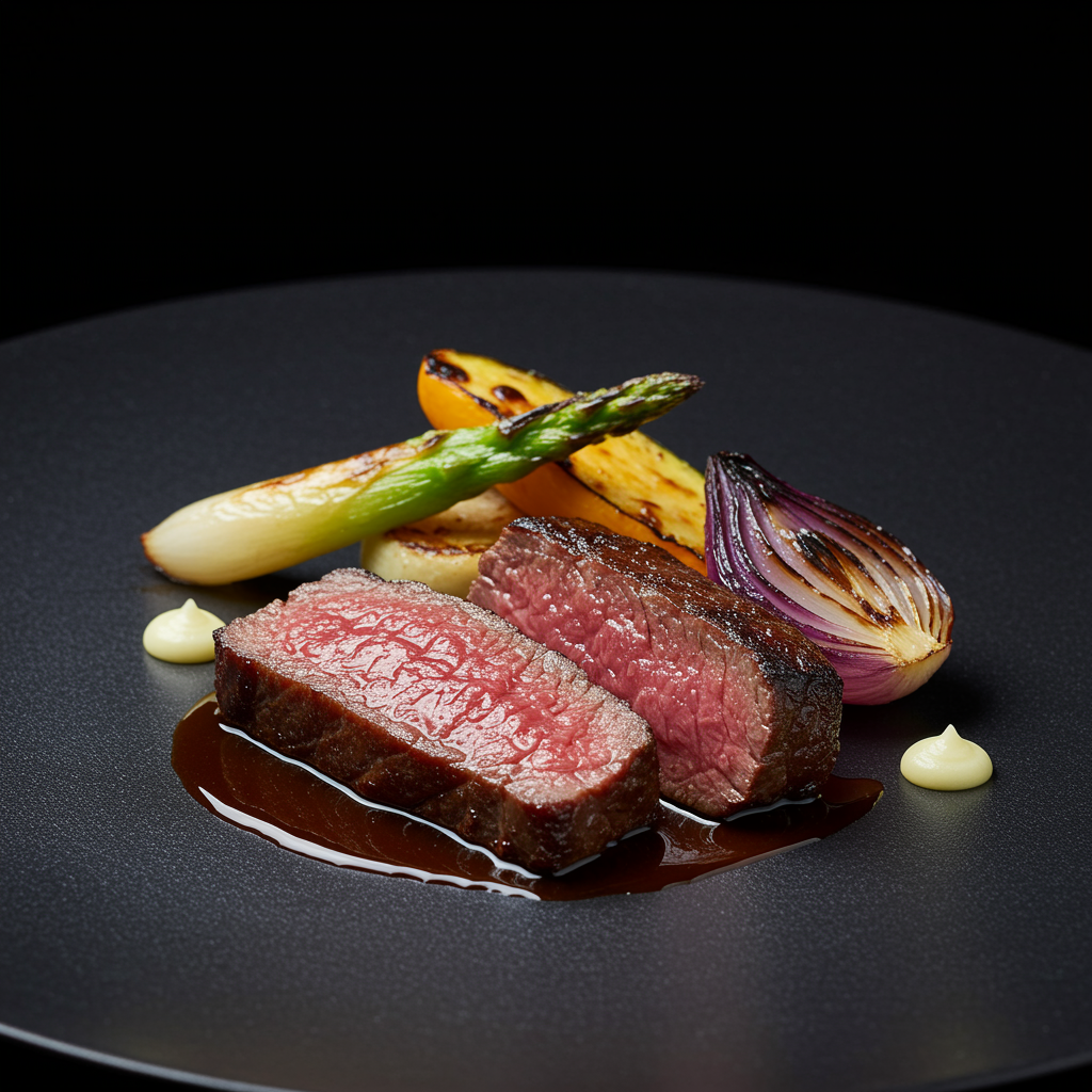 Exquisite culinary presentation of charred beef and roasted vegetables, captured with professional studio lighting in the sophisticated ambiance of a Michelin-starred kitchen; intricate details highlight the textures and colors, enhanced by a shallow depth of field to emphasize the artistry and luxury of fine dining.