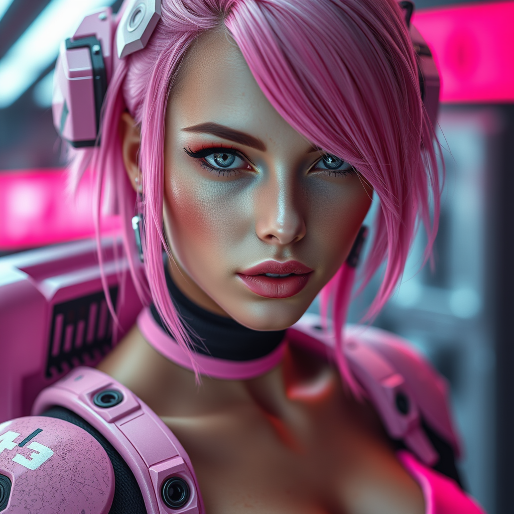 Exquisite cyborg woman in sleek pink combat armor, vibrant pink hair, alluring cyberpunk aesthetic, stylish lingerie, advanced futuristic theme, sci-fi allure, engaging, playful, captivating, detailed portrait, direct gaze, high-definition photography, intricate skin texture, photorealistic, ultra-high resolution, full-body composition, vivid RAW colors, soft diffused lighting, shallow focus depth, crystal-clear detail, cinematic CGI vibes with dynamic lighting, 3D elements, avoid low resolution, no text interference, eliminate imperfections, ensure accurate anatomy and proportions, maintain pristine quality and captivating visual coherence.