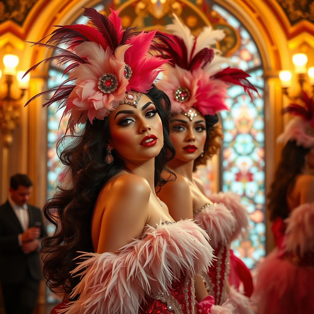Exquisite enchantress cancan dancers in the extravagant style of vaudeville burlesque, gracing the stage adorned with feathers and sparkling eyes, amidst opulent architectural splendor, unbelievably breathtaking, RTX enhanced, luminous gloss, in a lavishly cinematic style, capturing full body elegance, photographed by Canon and Hasselblad, with astonishing detail, m! shć, llll larpen, highlighting intricate features, utilizing professional and photographic lighting at 50mm and 80mm, evocative of nḿhotography aesthetics, akin to an Unsplash masterpiece.