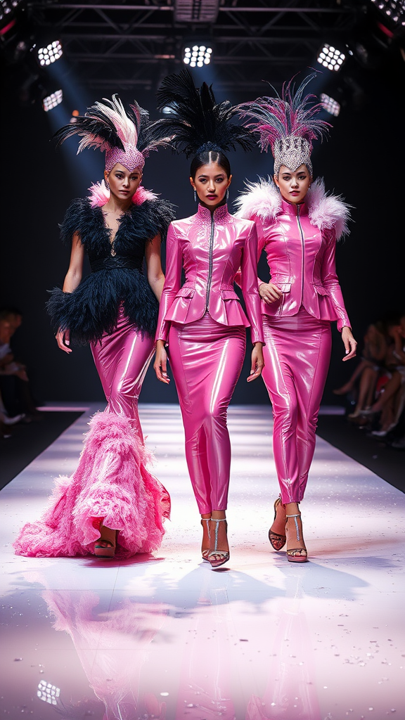 Exquisite ensembles, high fashion: models in elegantly tailored pink patent leather, adorned with crow feathers and luxurious boas, paired with towering high heels and shimmering glitter; showcasing the most intricate details and runway finesse, illuminated by dazzling spotlights --ar 4:5.