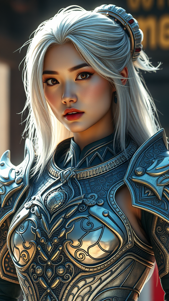 Exquisite female armor, intricately detailed stunning face, beautiful young Asian woman, full body, sun-kissed skin, medium-length silver hair, sculpted midriff, petite figure, hyperrealism, cinematic illumination, highly intricate, captivating, photographic, breathtaking setting, expansive cgi, 3d, ethereal, octane, render, with intentional artful distortion, diminished clarity, subtle anomalies, abstract anatomy, evolving forms, surreal extensions, imaginative hands, organic patterns, fluid shapes, artistic transformation.