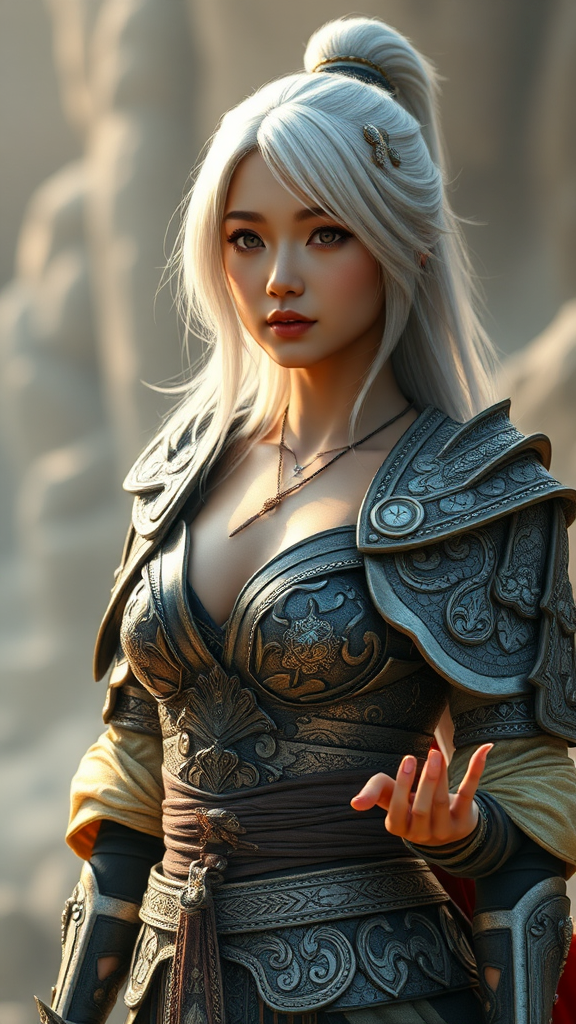 Exquisite female warrior, intricate ornate armor slightly revealing, captivatingly detailed youthful Asian woman, full body, warm olive complexion, shoulder-length silvery white hair, defined abdomen, petite bust, Hyperrealism, cinematic illumination, intricately detailed, awe-inspiring presence, lifelike depiction, breathtaking backdrop, wide-angle 3D CGI, doll-like allure, octane rendered imagery, elements of distorted anatomy, blurred imperfections, surreal extra limbs and digits, artistically abstract hands, optical illusions, warped and fantastical forms.