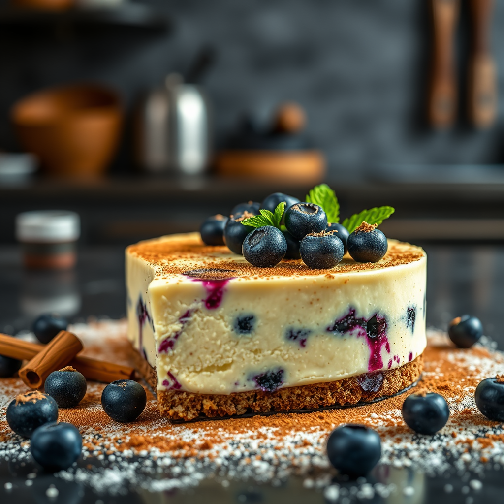 Exquisite food photography capturing a blueberry cheesecake adorned with a sprinkle of cinnamon, set in a luxurious Michelin-inspired kitchen. The scene features an enticing depth of field and showcases ultra-detailed textures with soft uplighting to highlight its natural features.