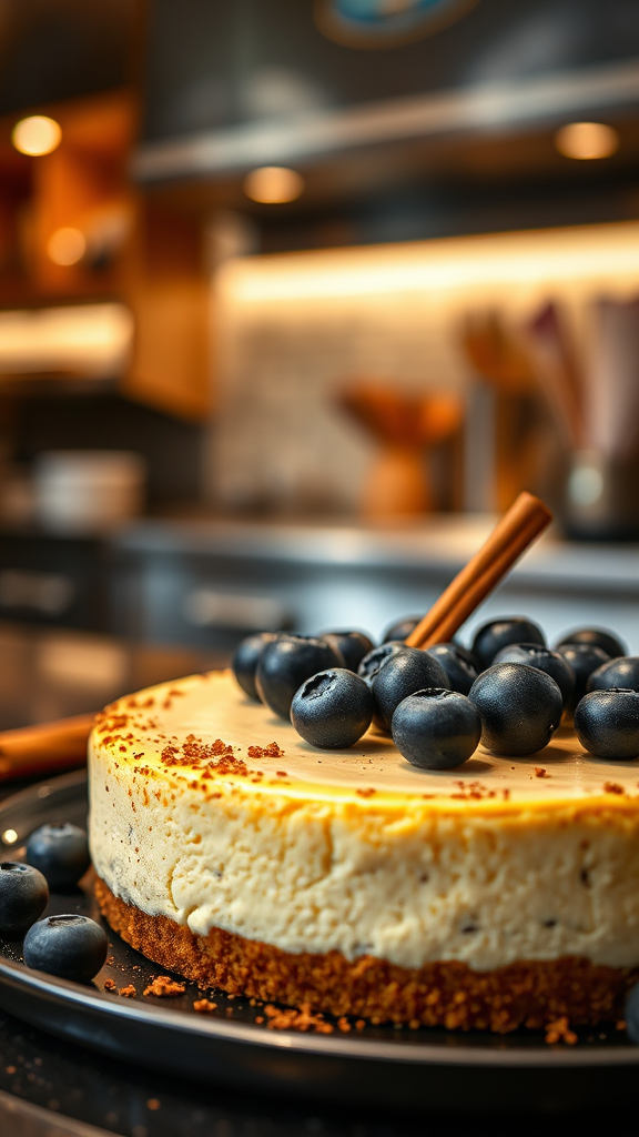 Exquisite food photography capturing a decadent cheesecake garnished with fresh blueberries and a hint of cinnamon, set against the opulent backdrop of a Michelin-starred kitchen. The scene is rendered with remarkable depth of field, showcasing ultra-detailed textures and highlighted by soft uplighting that accentuates the cheesecake's creamy texture and the natural sheen of the blueberries.