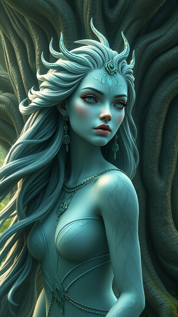 Exquisite forest deity woman with flowing hair and luminous skin, set against a backdrop of an enormous, ancient tree. Created with the artistry of MountainDog Studios, her face intricate and detailed, this character design exhibits a model sheet style in clip art form. Realized as a 3D render using digital 3D techniques and the power of Unreal engine, enhanced with VFX and cinematic lighting. Presented in an isometric, low-poly aesthetic, crafted in Blender for ultra-realistic, photo-realistic results achieving a cinematic quality in 8K resolution.