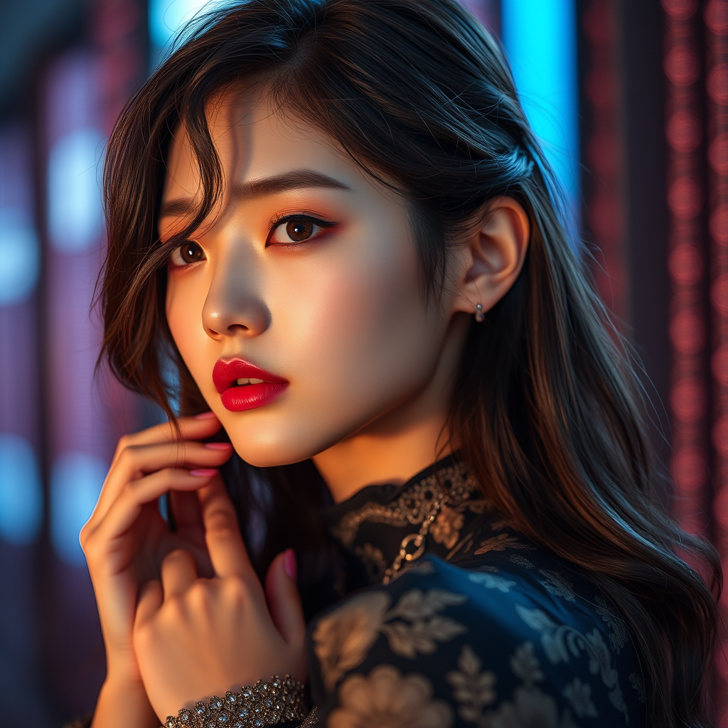Exquisite Korean woman, kpop star, dramatic lighting, high detail RAW color photo, professional photography, ultra-realistic, ultra-high resolution, photo realism, masterpiece quality, high contrast, 8k HD, hyper-detailed, best quality, using f1.6 lens, rich and vibrant colors, cinematic lighting, cinestill 800, CGI elements, digital art enhanced with 3D rendering aesthetics, anime influence, skillful illustration, digital painting, intricate sketch style, ensuring high quality, clear and sharp imagery, maintaining artistic elegance and beauty, appealing proportions, flawless anatomy, seamlessly detailed and captivating elements.