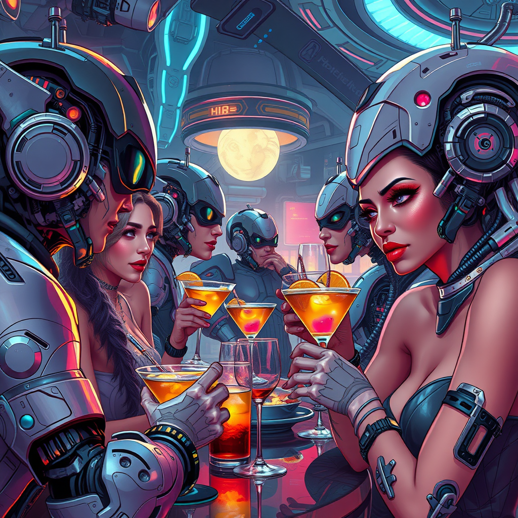 Exquisite sci-fi scene depicting people enjoying futuristic cocktails in a high-tech bar, surrounded by sleek robotic cyborgs showcasing intricate mechanical details, hyper-realistic, with a cinematic feel. The composition echoes the styles of Federico Pelat and Jan Urschel, featured in Artstation HQ. This artwork blends elements of drawing and painting, utilizing cel-shading techniques. Characters are adorned with striking make-up and bold lipstick, enhancing the vibrant yet surreal ambiance. The setting pulses with bionic influences, offering an immersive, visually stunning experience.