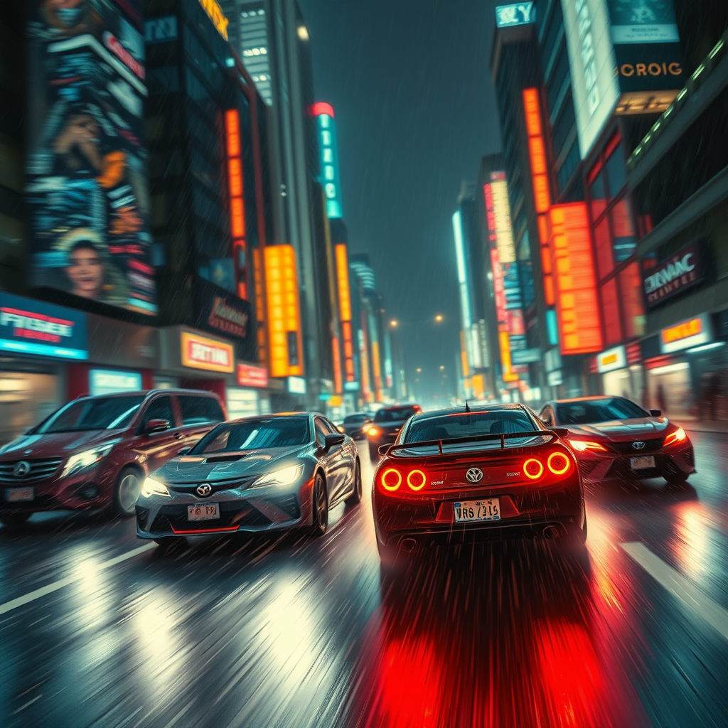 Exquisite, Top-Tier Action Movie Poster of a high-speed race through a vibrant cyberpunk city at night, vehicles zipping by at breakneck speed, almost invisible, amid heavy rain, featuring dynamic motion blur and bokeh effects. Captured in extreme detail with captivating cinematic lighting, the scene embodies the thrill of auto racing. Shot in 8k, presented in UHD and HDR, styled as a RAW frame with spontaneous cinema feel, reminiscent of a studio setup using 35mm film and color-graded with Portra 400 aesthetics. Stunning color presentation, captured using a cinematic camera setup akin to a FujiFilm XT3. Avoid elements such as logos, watermarks, poorly drawn assets, or any elements that deviate into cartoonish or 3D renders. Keep the universe realistic and immersive, ensuring only the essence of a live-action scene is conveyed.