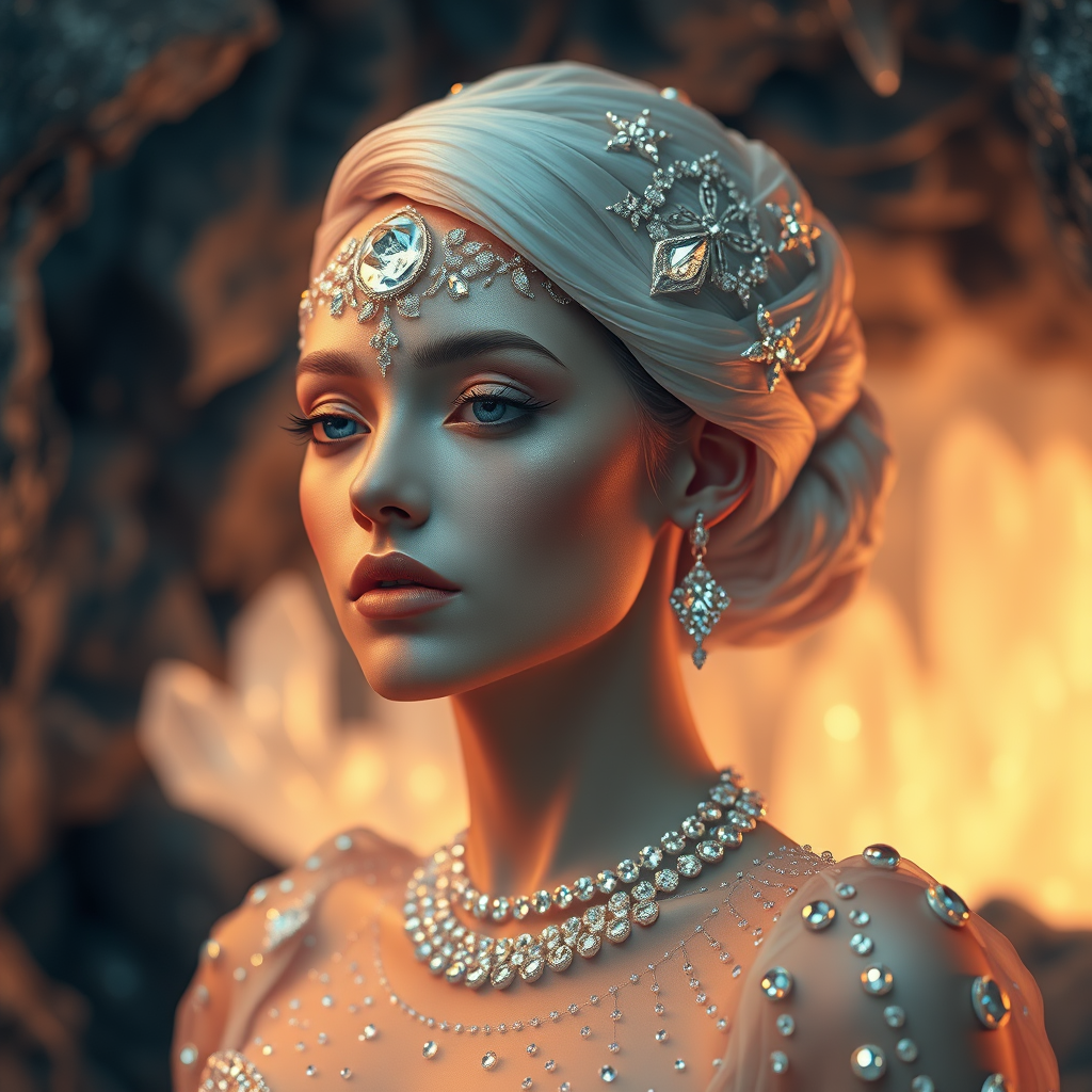 Exquisite woman crafted from shimmering diamond, silk, and gleaming gems, adorned with twinkling dots, set against a mystical cave of crystals, styled in the vein of Darek Zabrocki, embracing magic realism with a symphony of gradient colors. Bathed in cinematic lighting and bokeh effects, the scene boasts ultra-detailed quality and a compelling 3D render using octane and Unreal engine, enhanced with VFX in an isometric perspective, created in Blender. The result is an 8k ultrahd masterpiece ideal for a cinematic wallpaper, where the essence of elegance and enchantment is captured without focusing on a closeup portrait, maintaining a harmonious 1:2 aspect ratio.
