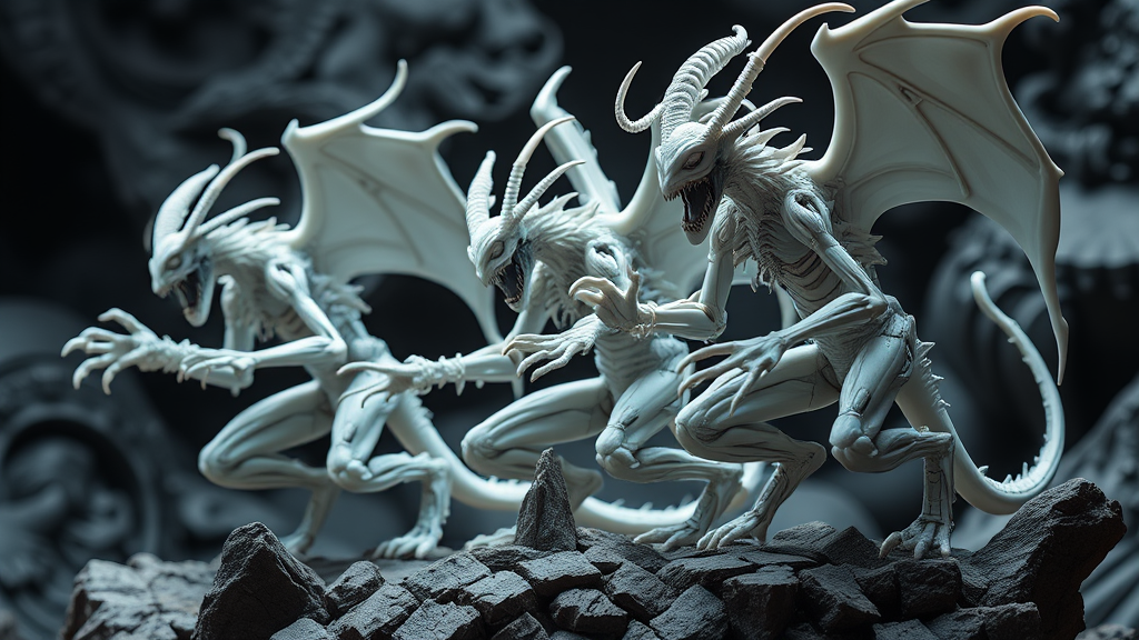 Exquisitely crafted porcelain cyborg demons in dynamic poses, showcasing intricate full-body models against a hyper-detailed, cinematic backdrop reminiscent of Miki Asai's macro photography. The composition features a sharp focus, studio-like lighting, and meticulous detailing. The scene, trending on ArtStation, embodies the artistic intricacy and surreal vision akin to Greg Rutkowski's work, emphasizing exquisite details and creative complexity.