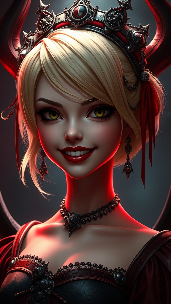 Exquisitely detailed 4k digital painting of Lady Dracula, exuding a blend of cuteness and mischief, her sharp teeth framed by a sly smile. She sports a stylishly short blonde hairstyle adorned with intricate headgear, capturing an essence reminiscent of vampire horror movie aesthetics. Inspired by Coppola's "Dracula," this piece reflects influences from Artgerm and Greg Rutkowski, making it a sought-after piece on platforms like ArtStation and Pinterest. Lady Dracula stands at the center, wrapped in cinematic lighting that enhances her hyper-realistic features and dramatic shadows. The setting is imbued with dark elegance, delivering an epic realism that transcends ordinary art. Every aspect is rendered with ultra-high definition clarity, akin to an award-winning photograph. The atmospheric overcast reflection mapping and sophisticated VFX post-production techniques draw upon the magic of Unreal Engine 5 and Redshift Render. With TX ray tracing lighting casting a compelling spotlight, this cinematic shot rivals those captured on a Nikon Z9, achieving an ultraphotorealistic 8k masterpiece.