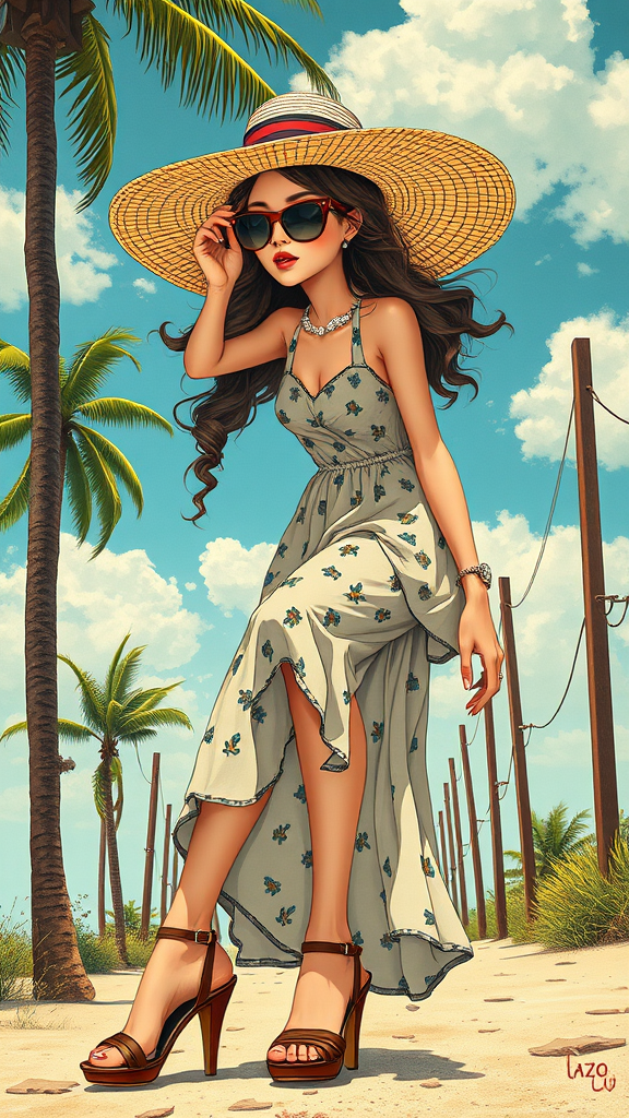 Exquisitely detailed and hyper-realistic anime imagery showcasing a humorous yet stunning high fashion model, adorned in chic high heels and fashionable sandals. She dons oversized hats and stylish sunglasses, complemented by cool sun dresses that echo the 1960s retro-futuristic vibe blended with a boho whimsical hippie charm. Infused with elements of the iconic American Gothic portrait, her appearance is artistically portrayed as a supermodel with an extremely beautiful and intricately detailed face, reminiscent of the styles of Charlie Bowater, Gil Elvgren, and Jack Hughes. The artwork is captured in ultra-high-definition, HDR, exploring the concept of duplication and mutation with cloned features, such as a cross-eyed gaze, elongated neck, and an artistic rendering of additional fingers and distorted hands. Despite its intricacies, the composition avoids low-resolution blurs, ensuring a crisp depiction devoid of out-of-frame artifacts, JPEG distortions, watermarks, logos, text, or cropped and cartoonish splits.