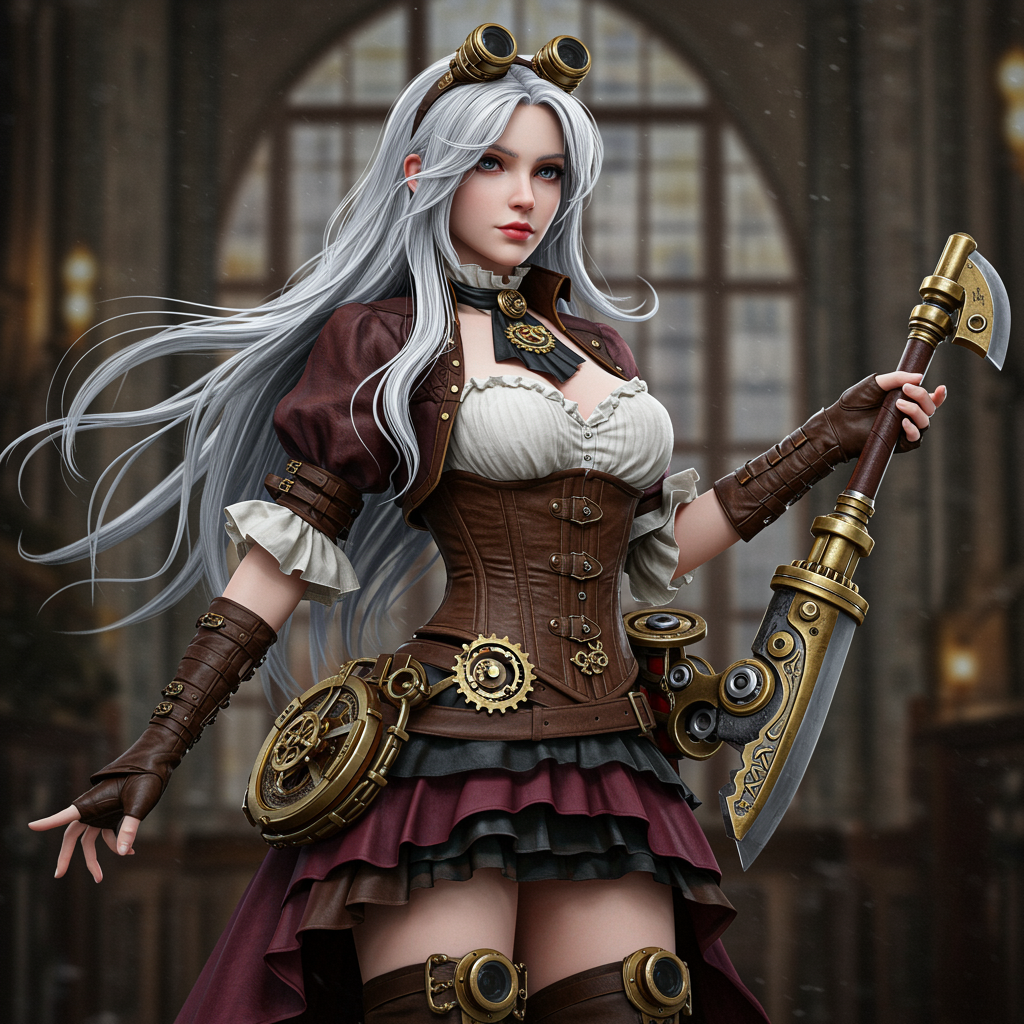 Exquisitely detailed steampunk woman with cascading silver hair, intricate steampunk attire, and a uniquely designed weapon, hyperrealistic and photorealistic visuals, rendered in 8k, utilizing the unreal engine for striking clarity, with an aspect ratio of 9:16, niji 5 influences, an expressive style, and a softness of 400 for added depth.