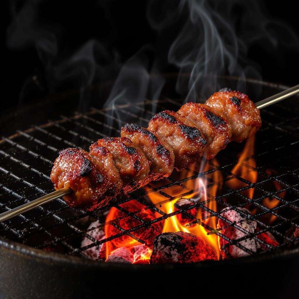 Exquisitely seasoned skewered meats sizzle enticingly on a barbecue, nestled above glowing hot coals, with flickering tongues of flame dancing beneath. Captured in studio photography style, every detail is richly textured and mouth-wateringly vivid, emphasizing the intricate char and juicy succulence of each morsel.