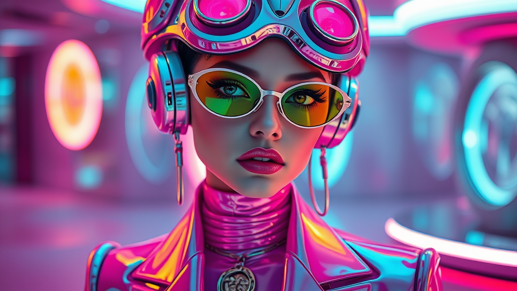 Extraterrestrial fashion icon in a luminescent, color-saturated setting; sharp focus captures mesmerizing details, blending futuristic glamour with cinematic allure. Clad in kitsch yet sophisticated attire reminiscent of a high-end Vogue or Prada editorial, the character exudes the opulence of Versace with a dreamy glow. The fantastical realism and vibrant flair create an otherworldly magazine shoot, capturing the imagination of the fashion world with its avant-garde flair and glossy, luxurious essence.