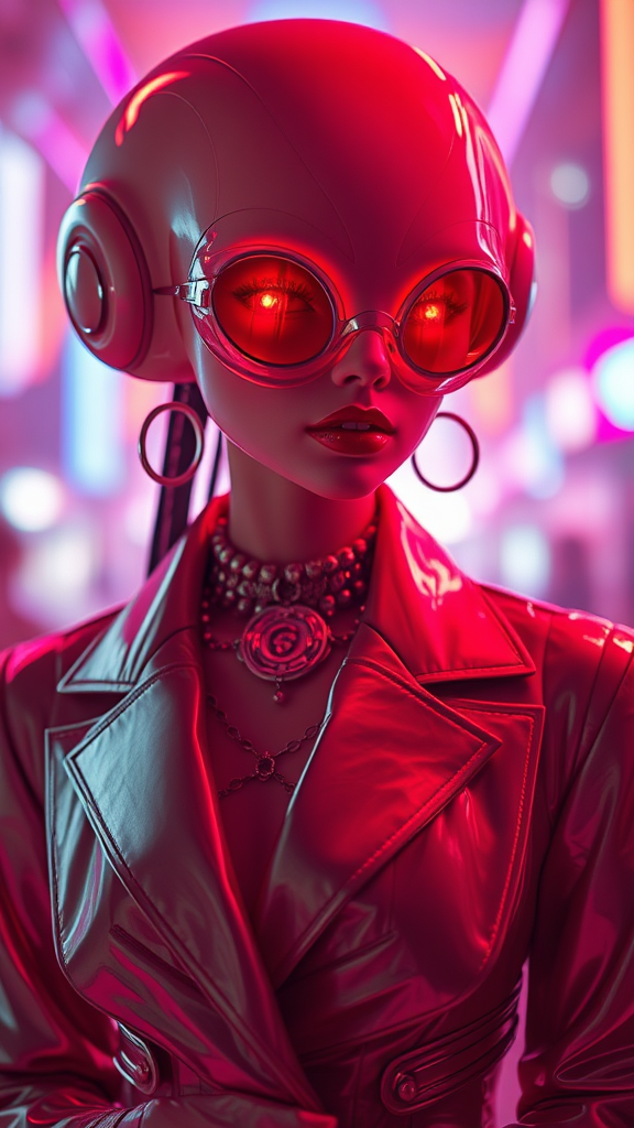 Extraterrestrial fashion icon with a glamorous, detailed luminogram aesthetic in sharp focus, exhibiting vibrant colors and clear details. This cinematic character exudes high-fashion allure, embodying a fusion of Vogue, Prada, and Versace influences. With a dreamlike glow, the ensemble features an editorial-worthy kitsch outfit that captures the essence of the fashion world. The look blends fantastic realism with an otherworldly charm, as if part of a stylish magazine shoot that marries fluff and sophistication in a uniquely imaginative presentation.