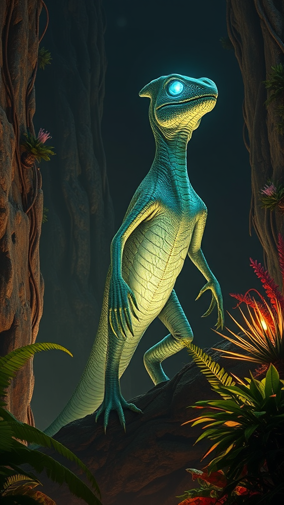 Extraterrestrial saurian creature standing tall, with luminescent scales and elongated limbs, set in a towering vertical landscape. Its eyes shimmer with an otherworldly glow, reflecting unfamiliar constellations. The surrounding environment is a blend of vibrant tropical foliage and bizarre alien flora, casting strange shadows in an eerie twilight.