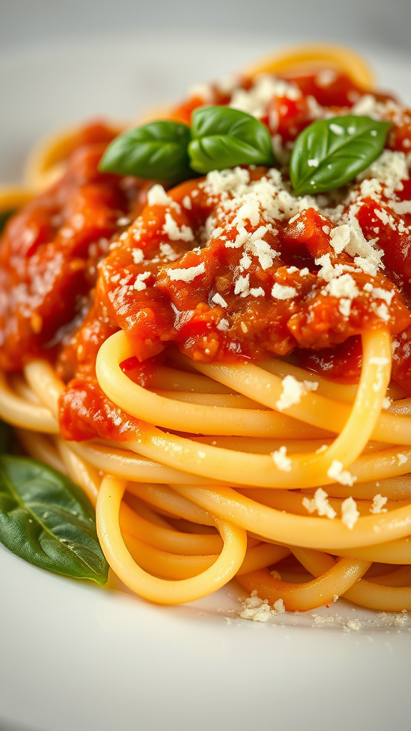 Extreme close-up, a dish of fettuccine with rich tomato basil sauce, photorealistic, in the style of fine dining food photography, vibrant colors, with a sprinkle of freshly grated parmesan and a garnish of basil leaves, high-contrast lighting, --chaos 15 --ar 1:2.