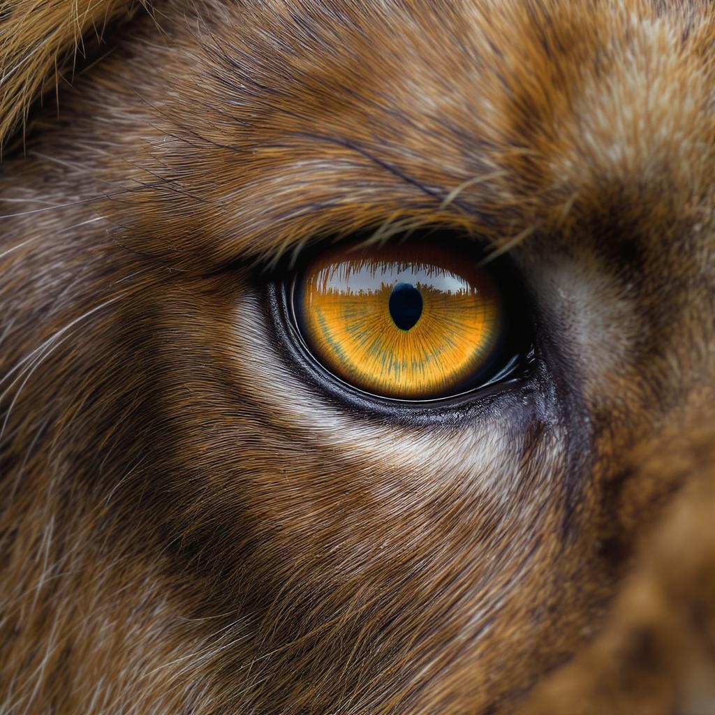 Extreme close-up hypermacro shot of a lion's eye, exuding intense ferocity and raw emotion, with a gaze that captures fierce determination and rage. The eye is strikingly expressive and realistic, showcasing intricate details with ultra-high precision. The hyperrealism of the scene is enhanced by cinematic lighting that accentuates every nuance, immersing you in a 4D-like dimension of visual experience. The ultra-detailed quality and dynamic lighting combine to create a photo-realistic image that feels vibrantly alive and captivating.