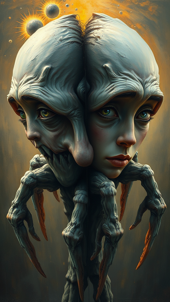 Extreme detail, 8k, ultra quality, masterpiece, illustration, photorealistic, hyper realistic, intricate sharp details, dramatic lighting, oil painting, vivid eyes, expressive face, endless memories illuminate what was once shrouded in darkness, allowances made for each credible assertion, yet some dissipate like dust in the wind, artist signature, two heads combined in abstract harmony, unusual form with extra limbs and twisted contours, reminiscent of a surreal sculpture, multiple legs and fingers, partial figures that transcend the frame, echoes of jpeg artifacts, resembling a plasticine model.