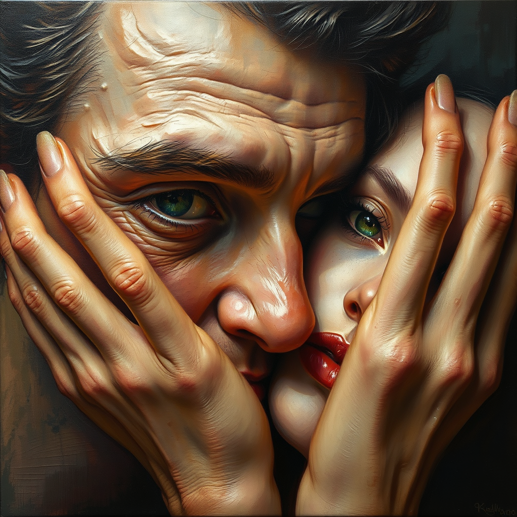 Extreme detail, 8k, ultra quality, masterpiece, illustration, photorealistic, hyper-realistic, intricate sharp details, dramatic lighting, oil painting, vivid eyes, expressive face, a cascade of memories illuminated, once hidden now revealed, each compelling moment standing against the dissolution into dust, ephemeral like particles in the breeze, signature watermark, artist's touch, dual visages interwoven, an abstract dance, surreal limbs emerging and retracting, sculpted like plasticine forms, multiplying like whispers, twisted elegance, overspilling the canvas, partial glimpses beyond measure, caught in a dance of clarity and distortion, mosaic impressions, the artifact of memory, plasticity of form, model of recollection.