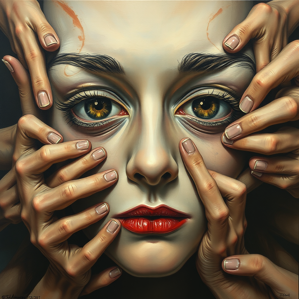 Extreme detail, 8k, ultra quality, masterpiece, illustration, photorealistic, hyper-realistic, intricate sharp details, dramatic lighting, oil painting, a face with eyes that hold the universe within, capturing endless memories that flood into the open, once obscured, the subjects depicted make bold claims, yet some truths disintegrate like dust in a breeze, artist signature, two faces intertwined in thought, distorted and surreal, limbs multiply in a bewildering dance, embracing or fighting their own formation, model-like features but with exaggerated, countless fingers, legs extending beyond the frame, revealing only glimpses, blurred and edged with the nuances of digital compression, the line between real and artificial blurring, offering a snapshot of chaotic harmony.