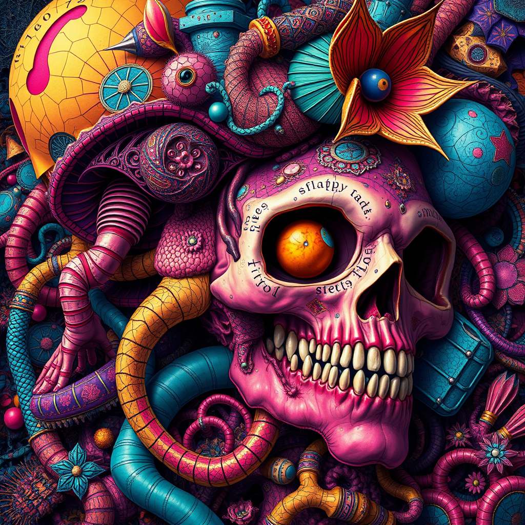 Extreme detail and vibrant colors combine in a lively, intricate composition featuring playful patterns and rich textures. Inspired by the unique visual style, the artwork maintains a vivid, high-resolution appearance, employing techniques of optical mixing. The piece presents a surreal and imaginative scene with careful attention to anatomy and form. Elements of the macabre are subtly woven into the design, avoiding any disconcerting distortions or anatomical inaccuracies. The intriguing interplay of geometry and abstract horror elements provides depth and intrigue. The imagery captures a balance between fantasy and reality, skillfully avoiding any unwanted features or distractions.