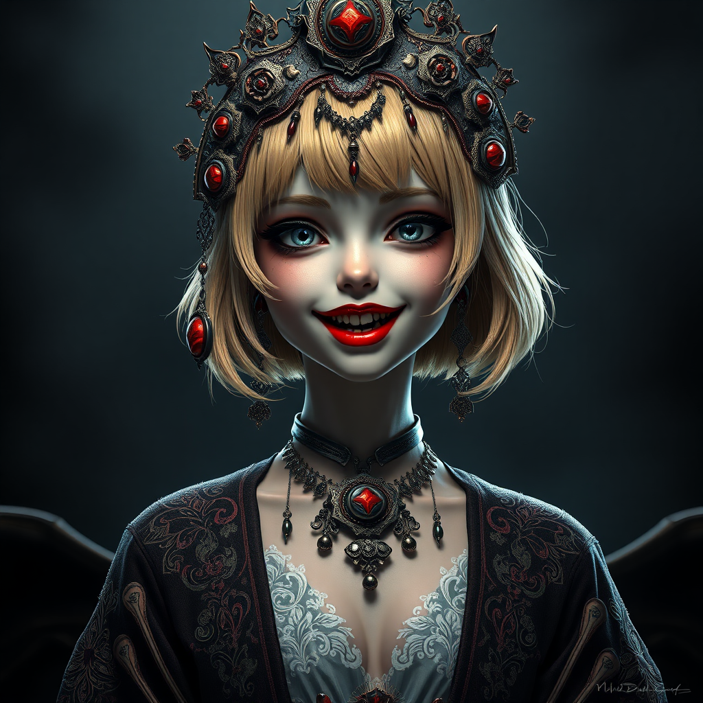 Extremely detailed 4k digital painting of a mischievously cute Lady Dracula, featuring sharp teeth and short blonde hair, adorned with intricate headgear. The composition is inspired by the vampire horror movie style reminiscent of Coppola's Dracula, capturing the essence of Artgerm and Greg Rutkowski's artwork. Set against a dark backdrop, the scene is vividly realistic, with Lady Dracula standing centrally, adorned in ornate attire. The piece boasts cinematic lighting, revealing intricate details and dynamic shadows with overcast reflection mapping. This ultra-realistic, epic concept art delivers movie-quality visuals through a combination of VFX post-production, dramatic rim lighting, and high-detail RAW color art. Rendered in UHD 8k using Unreal Engine 5 and Redshift, the image echoes the craftsmanship of a cinematic shot captured on a Nikon Z9, featuring tx ray tracing lighting and a spotlight effect for an award-winning photograph-like finish.